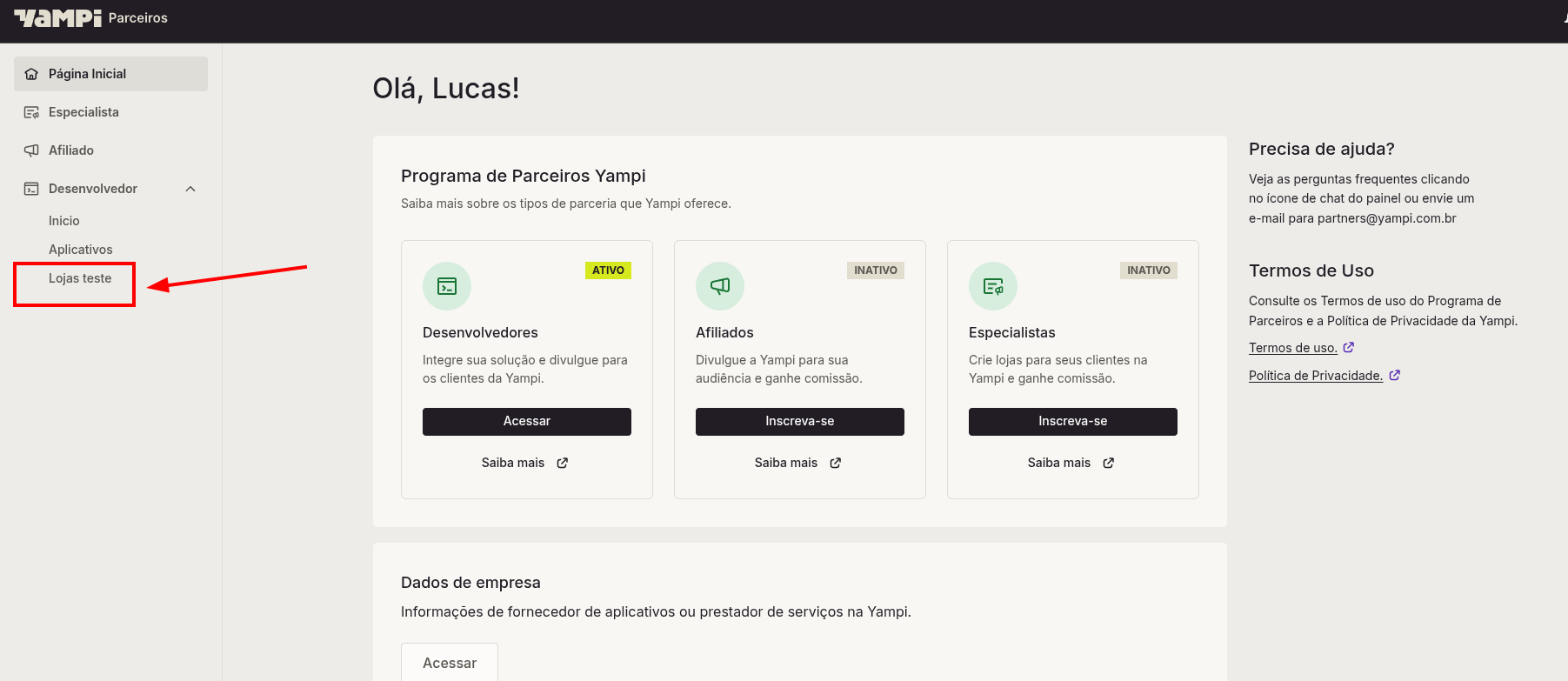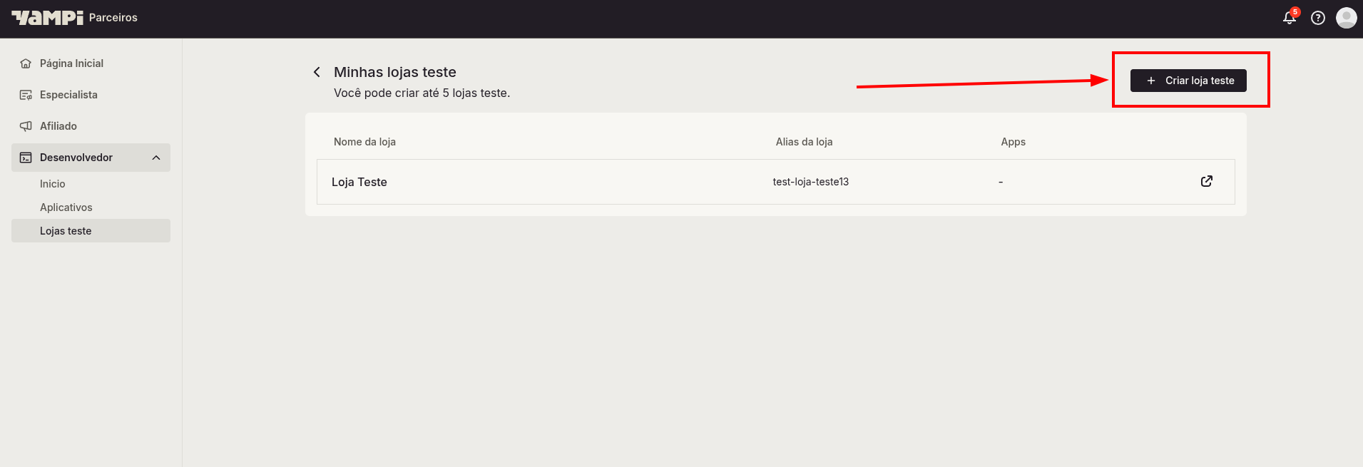 Na página inicial do seu painel, clique em “Lojas Teste”.\
