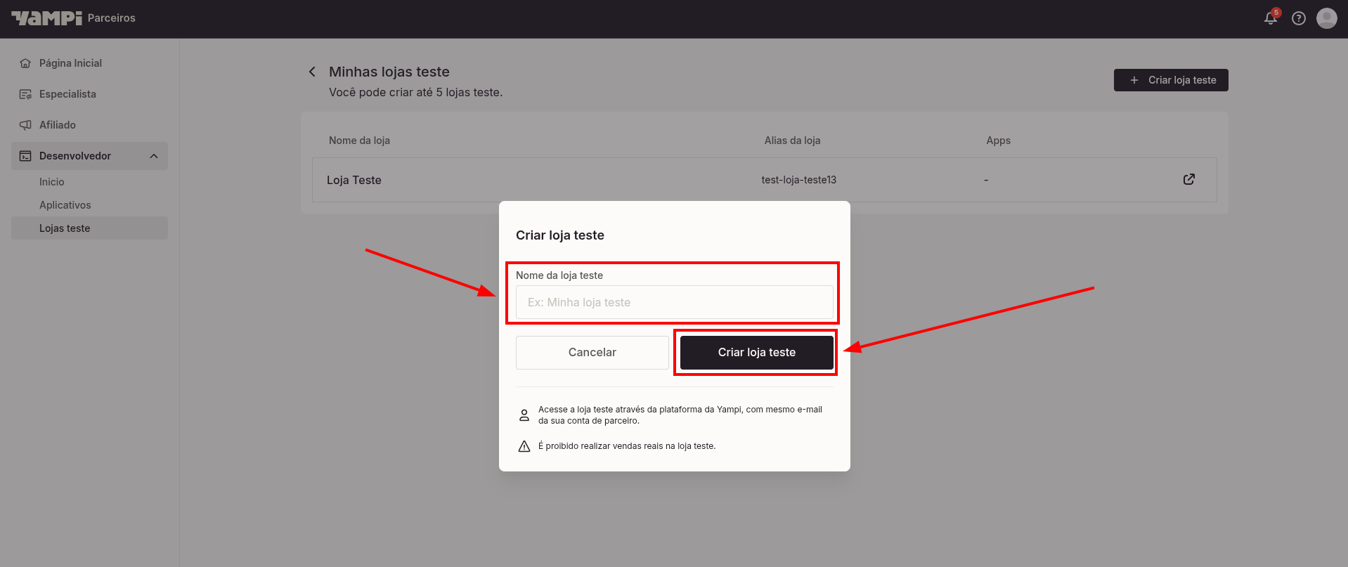 Depois, escolha um nome para sua loja e clique em “Criar loja teste”.